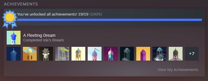 I picked up Monument Valley in the same Humble Bundle I got Baba Is You in. I’d previously played the first on Android and remember having a good time so I decided to replay it in this Steam release. This Panoramic Edition also includes extra chapters and DLC.